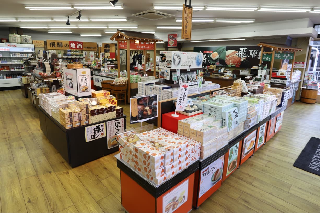 ここには、飛騨牛や地元の素材でつくる味覚の逸品、香り高い地酒、そして心を温める民芸品が並びます。どれも旅の思い出を紡ぎ、贈る人、贈られる人の笑顔を想いながら選んだ特別な一品です。